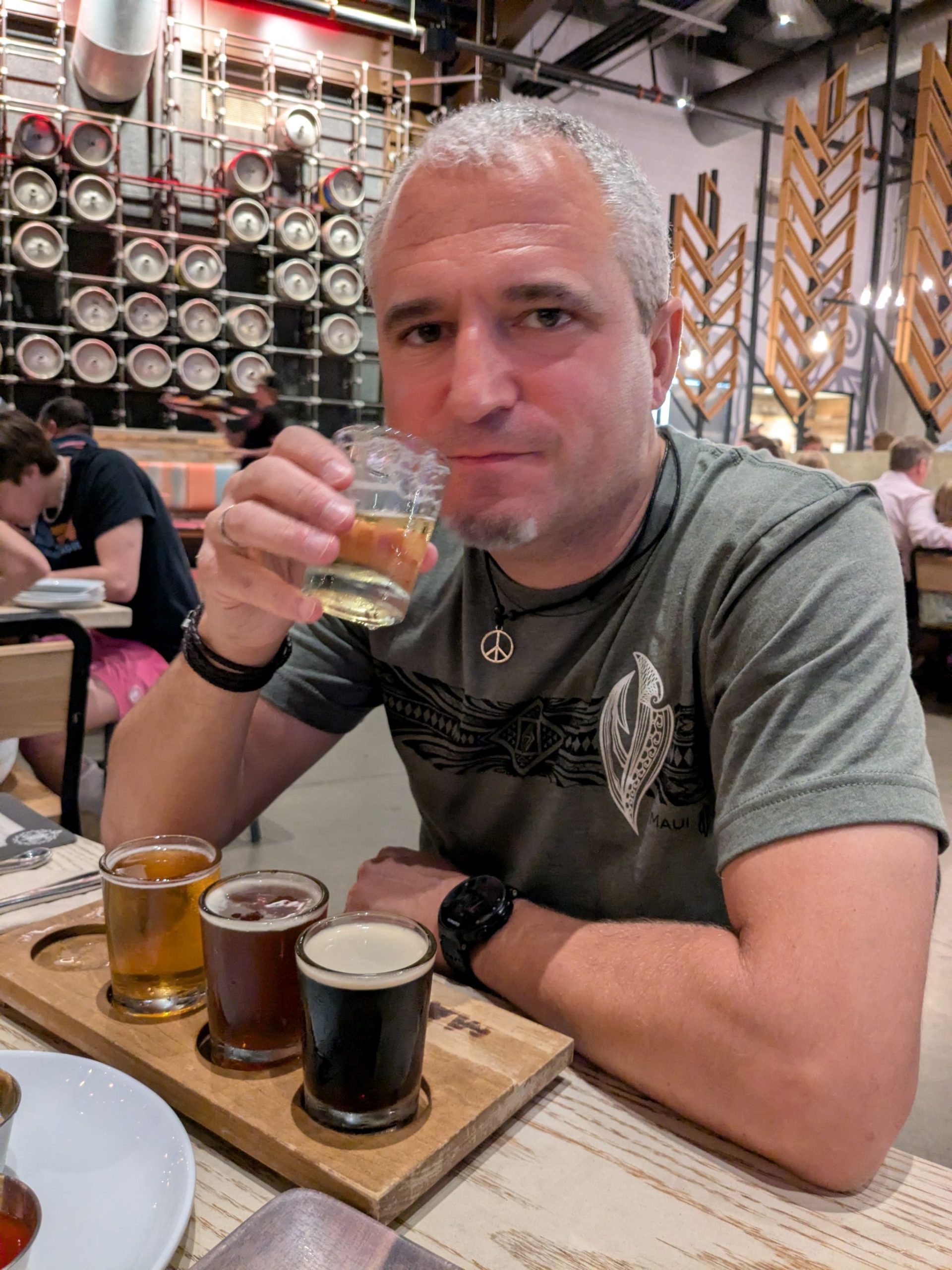 Martin kostet sich wieder durch die verschiedenen Biersorten und neben den Fries probieren wir den Ahi Poke Stack – das sind Schichten aus Thunfisch in Sushi-Qualität, Avocado, Gurken, würziger Mayonnaise und Reis. Schmeckt sehr lecker!